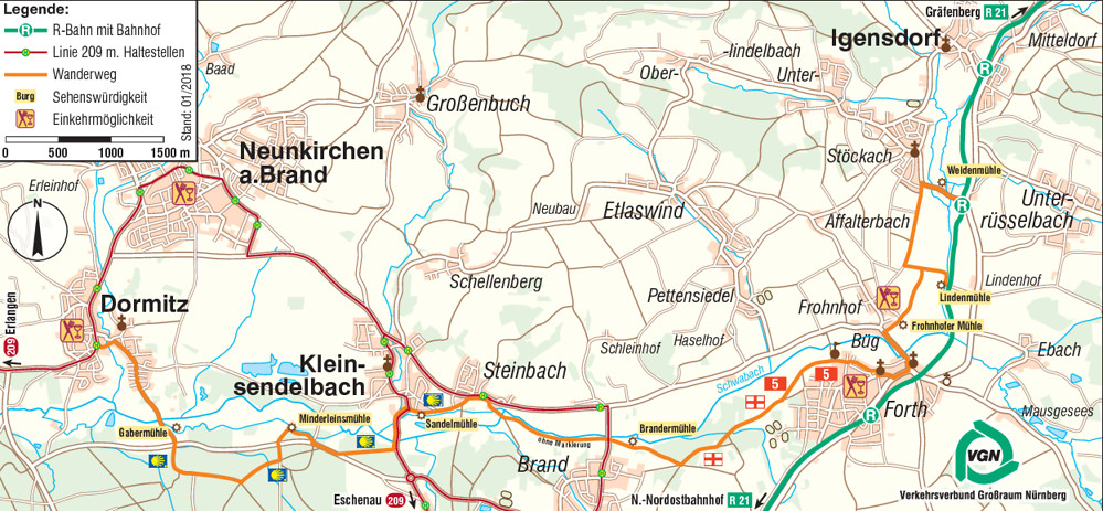 Steinbach – Sendelmühle (km 8,7) – Minderleinsmühle (km 9,8) – Gabermühle (km 11,6) – Dormitz ’ - Linie 209 Dormitz (km 12,8)
