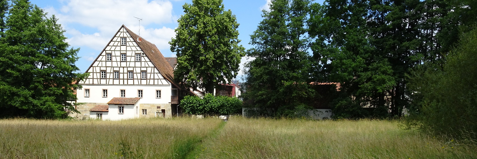 Dieser wollen wir soweit es geht folgen, möglichst nah und naturnah am Fluss ent­lang. Das geht erstaunlich oft und zeigt uns idyl­lische, oft un­be­kannte frän­kische Flusslandschaften mit Wiesen, Bächen, Mühlen, Auenwäldern, Äckern und Feldern von der schönsten Seite. Wir kommen an altertümlichen Wehren, großzügigen Hofanlagen, ursprünglichen frän­kischen Fachwerkbauten, an einer alten mächtigen Tanzlinde und manch anderem Staunenswerten mehr vorbei. Viele der stattlichen Mühlengebäude sind gut er­hal­ten und restauriert und haben ihren romantischen Charme bis heute er­hal­ten.