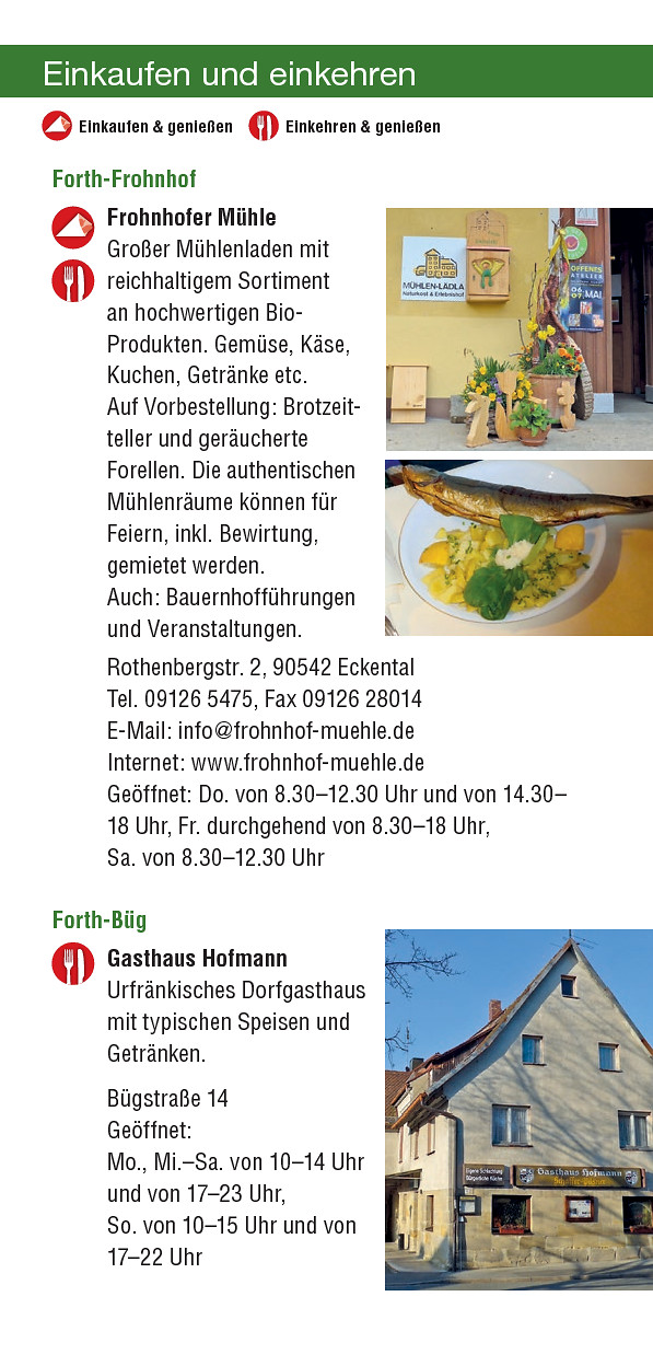 Sie bestand schon vor 1300, eine Turbine wurde 1953 – wie bei vielen Mühlen in dieser Zeit – eingebaut und in den 1960ern noch 1 Tonne Getreide pro Tag vermahlen. Heute betreiben die Besitzer Biolandwirtschaft und einen schmucken Bioland-Hofladen mit großer Auswahl. Es gibt kalte Getränke, Kaffee und – selbst­ver­ständ­lich – selbstgebackene Kuchen in den ursprünglich er­hal­tenen Mühlengemächern oder im Garten sowie auf Vorbe­stel­lung Brotzeitteller, Käseplatten und geräucherte Forellen. Der Wanderer kann sich seinen Rucksack für die nächste Wegzehrung füllen.