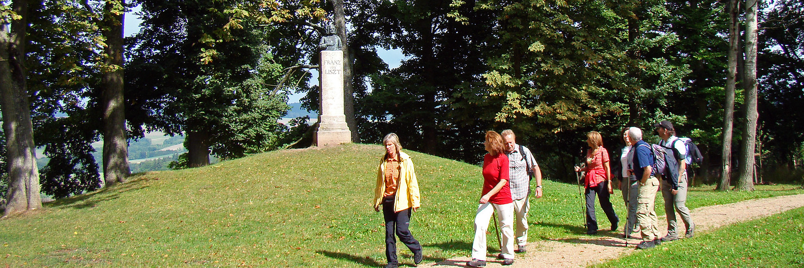 Hinter einer Umzäunung spitzt ein Mausoleum hervor, das sich Reichskanzler Chlodwig noch zu Lebzeiten erbauen ließ. Nachdem wir die Aussicht genossen haben, machen wir kehrt und laufen rechts durch die Parkanlage, vorbei am Denkmal des Komponisten Franz Liszt, zu deren Ausgang. Hier queren wir die Straße und nach 7 Treppenstufen dann über den Parkplatz erreichen wir die Schlossanlagen. Ein wunderschöner Biergarten mit ebensolcher Aussicht empfängt uns als Belohnung für die bis hierhin gut 1,5-stündige Wanderung. Je nach Zeitlage und Tagesplanung kann man hier u. a. das Barockschloss der Fürsten zu Hohenlohe-Schillingsfürst (1723–1750) besichtigen.