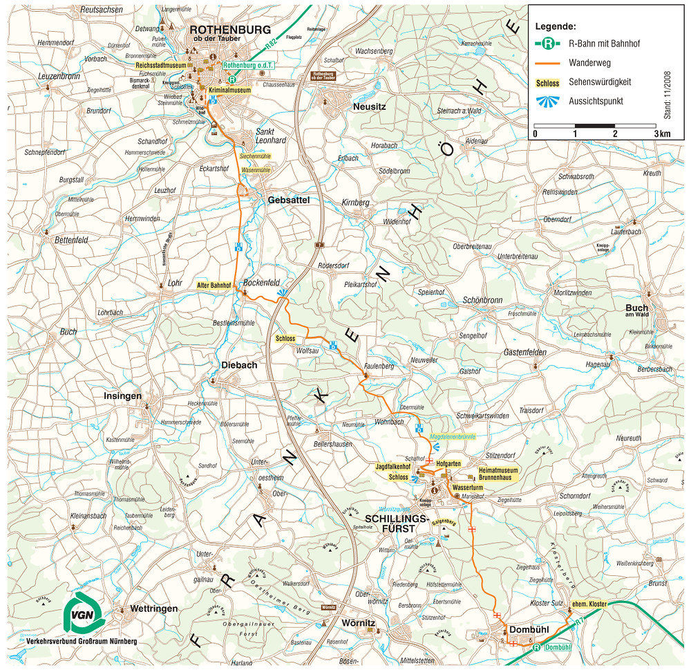 Diese ausgiebige, abwechslungsreiche und durchwegs gut markierte Tagestour, die auch in Schillingsfürst begonnen werden kann, bietet neben weitreichenden Panoramablicken auch die Möglichkeit, durch naturbelassene Bereiche des Naturparks Frankenhöhe zu wandern. In Rothenburg o. d. Tauber kann man die Wanderung vielseitig, ggf. auch mit einer Übernachtung, ausklingen lassen.