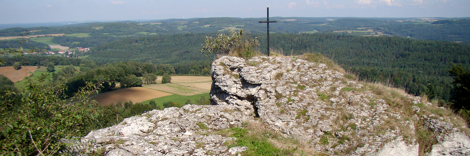 Bei der Station „Kumulus – Bindeglied zwischen Himmel und Erde“ genießen wir die östliche Aussicht Richtung Fichtelgebirge, folgen dem Rundweg aber dann nach links und umrunden den Tafelberg im Uhrzeigersinn. Bei guter Aussicht kann man sich – egal zu welcher Jahreszeit – nicht satt sehen. Um so schwerer fällt es einem, nach den Felspartien (mit Gipfelkreuz) am Nordhang allmählich aufzubrechen.