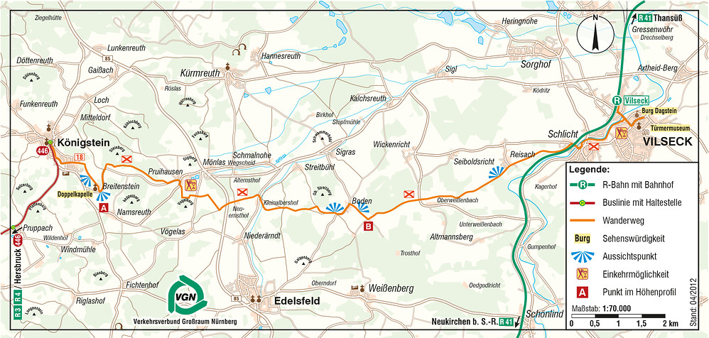 bringt uns in einer guten halben Stunde nach Hersbruck (rechts der Pegnitz). An der Bushaltestelle am Bahnhofsvorplatz steigen wir dann in die Linie 446/498 bzw. sonntags von Etzelwang in die Linie 499, die uns durch das Hirschbachtal bis nach Königstein am Fuß des Ossingers bringt. Die Wanderung beginnt am Marktplatz von Königstein i. d. OPf. im Naturpark Fränkische Schweiz/Veldensteiner Forst und führt über die Doppelkapelle Breitenstein und zahlreiche Hügelketten mit weitreichenden Ausblicken bis nach Vilseck.