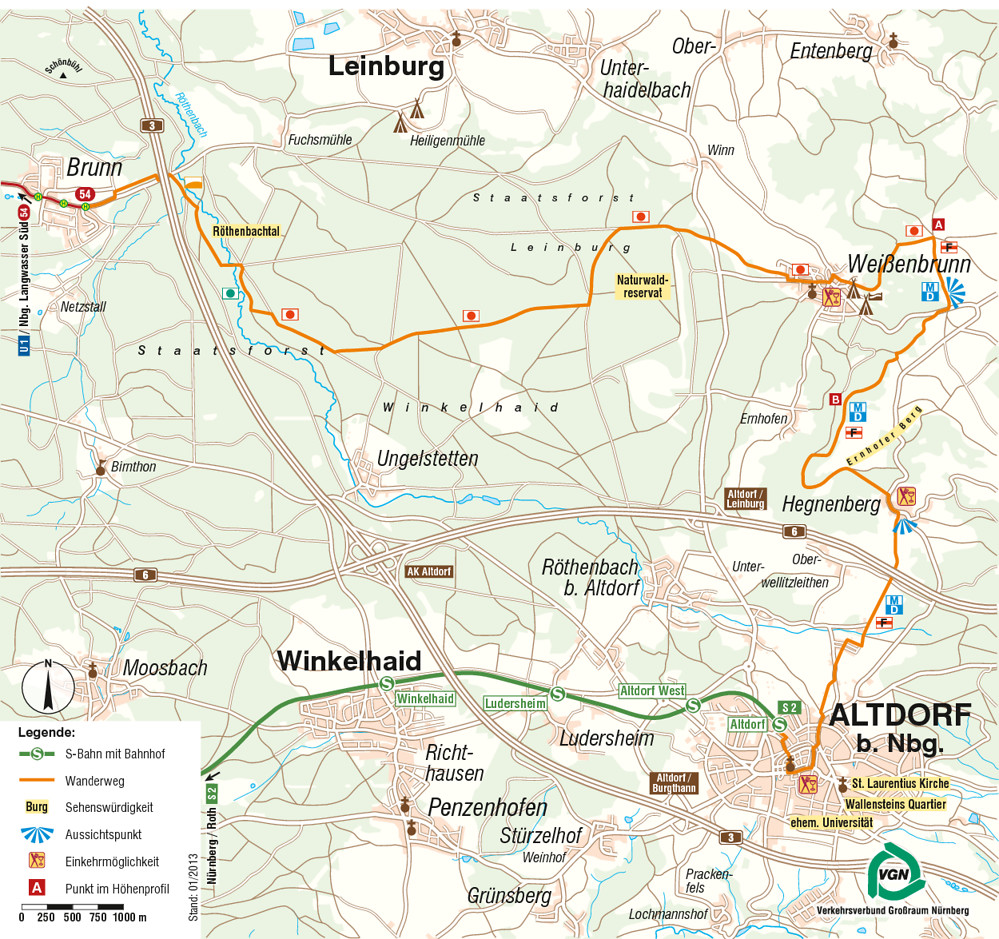Gleich zu Beginn der Tour wartet das liebliche Röthenbachtal auf uns. Dieser kurze Abschnitt des Frän­kischen Dünenweges ist für jeden Wanderer ein Genuss. Überwiegend durch den Fichtenund Föhrenbestand des „Steggerlaswaldes“ verläuft die mittlere Passage der Route vor den Toren Nürn­bergs. Außer dem knackigen Anstieg von Weißenbrunn hinauf zur Klingenhofer Höhe sind keine weiteren Anstrengungen zu bewältigen. Die Wan­de­rung kann auch in Weißenbrunn (Bus 331) begonnen oder beendet werden.