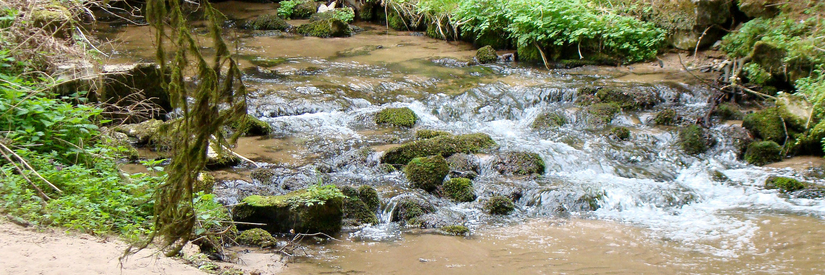 Bei einer alten Sandsteinbrücke schwenken wir nach rechts. Nach ca. 100 m geht es dann schräg nach links abwärts auf einen Pfad, der sich nach einem kurzen Anstieg durch den Föhren- und Fichtenwald schlängelt. Wieder bringt uns ein Holzsteg dann auf die andere Bachseite (km 2,1).