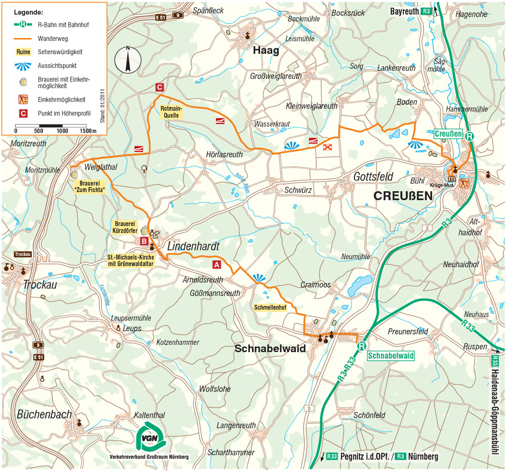 Die ausgiebige Tagestour führt im ersten Abschnitt durch die nahezu unberührte Hügellandschaft vor den Ausläufern des Fichtelgebirges. Bis Lindenhardt nicht markiert, vertrauen wir dann auf das „Seidla“ des Bierquellenwanderweges, das uns zu den beiden Privatbrauereien Kürzdörfer und „Zum Fichta“ begleitet. Nach der Hälfte der Strecke übernimmt der Fränkische Gebirgswegs über die Rotmainquelle – weiter zunächst durch schattige, naturbelassene Wälder – die Führung. Der letzte Abschnitt im freien Gelände eröffnet dann Ausblicke bis zum Rauhen Kulm und zum Fichtelgebirge mit Ochsenkopf und Schneeberg, bevor es hinein nach Creußen mit seiner historischen Altstadt geht. Da es ab Weiglathal bis Creußen keine Einkehrmöglichkeit mehr gibt, empfiehlt es sich, hier ausreichend Proviant mitzuführen. Wegen einiger anfangs grasiger Passagen sind lange Wanderhosen ratsam.
