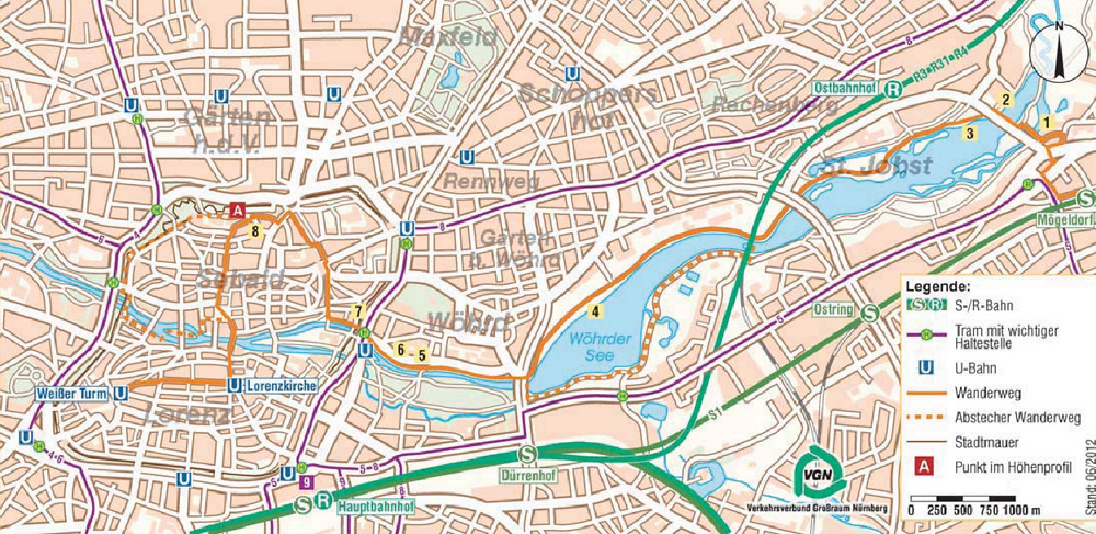 -Bahn S1, der Straßenbahnlinie 5, dem Bus 40 oder 45, Ausgangspunkt zu unserem Stadtspaziergang ist der Mögeldorfer Plärrer.