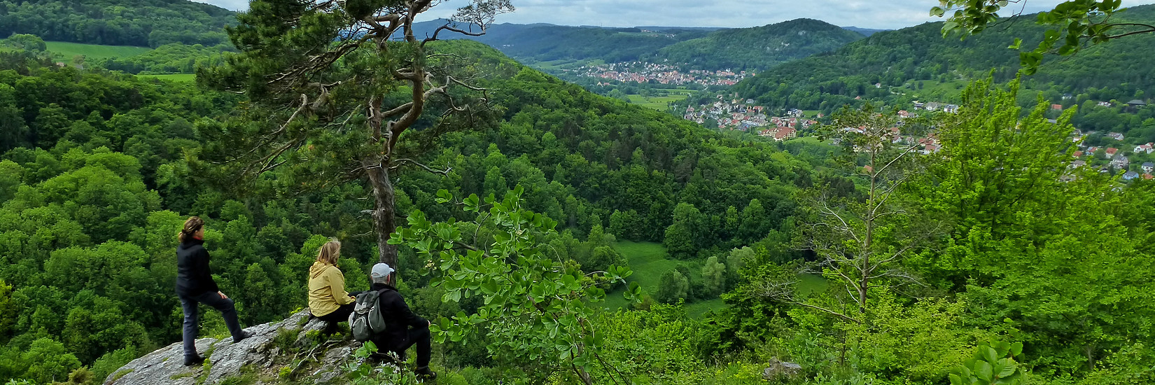 zweigt rechts ab – und ein Stück am Waldrand entlang. Bald rechts in den Wald hinein abzweigend und moderat nach oben, dann relativ eben weiter, erreicht unser Weg eine Lichtung. Vor uns, auf der gegenüberliegenden Talseite: die Felsgruppe des Zankelsteins (547 m), rechts die Zwillingstürme, links davon der Basteifelsen mit seiner Aussichtsplattform.
