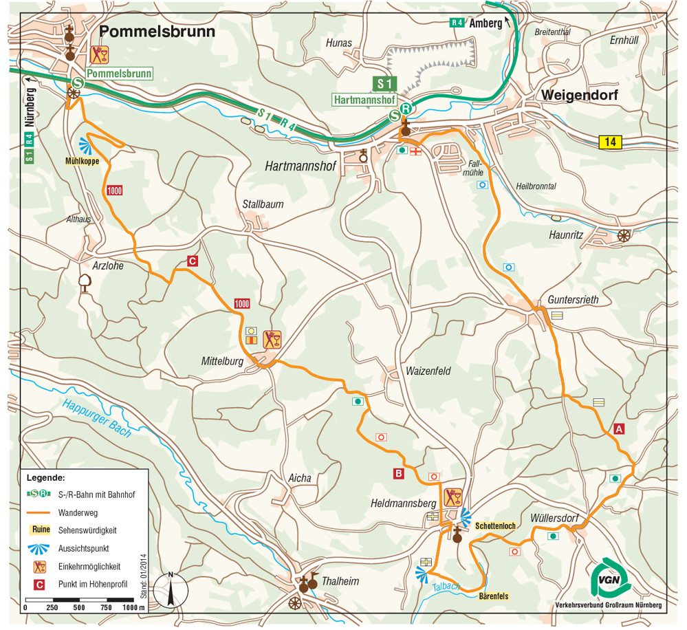 wieder einmal geht es nach oben. und geben nach links die Richtung vor. Gewohnt gut markiert zweigt der Weg rechts ab und führt nach dem Scheitelpunkt an einer eingezäunten Lichtung endlich wieder abwärts Richtung Mittelburg. Vor dem zur Gemeinde Pommelsbrunn gehörenden Dorf werden rechts die Steinbrüche von Hartmannshof sichtbar. Auf dem Sträßchen nach links in den Ort hinein, bietet sich gleich wieder rechts auf einem Rastplatz oder im Gasthaus „Zur Linde“ die Möglichkeit zur Einkehr oder zu einer Verschnaufpause.
