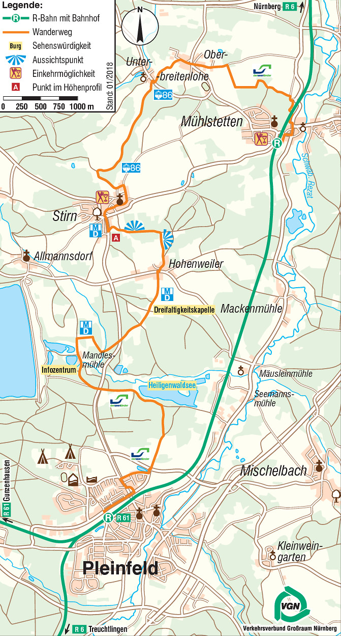 aus verlassen wir das Bahngelände durch die Unterführung der Gleisanlagen (Ausgang Brombachsee/Sportzentrum) auf der gegenüberliegenden Bahnhofseite. Danach die zwei Treppen hoch und rechts ab, nur kurz den Wanderzeichen folgen. Ohne diese nach links weisenden Ausschilderungen dann geradeaus weiter parallel zum Nordring. Beim Rechtsknick an dessen Ende nun schwungvoll geradewegs runter zur Stirner Straße, dort links. Nach rund 200 m wechseln wir über eine kleine Verkehrsinsel vorsichtig die Straßenseite. Drüben links ab und danach die Straße „Am Espan“ überqueren. Bei der folgenden Kreuzung rechts ab und nach einem Wendehammer geradewegs in einen befestigten Weg, bald am Hörbachweiher entlang, wieder vor zum Nordring. Dort links ab, tauchen vor der Staatsstraße WUG 18 auf der anderen Straßenseite unsere ersten Wegezeichen auf.