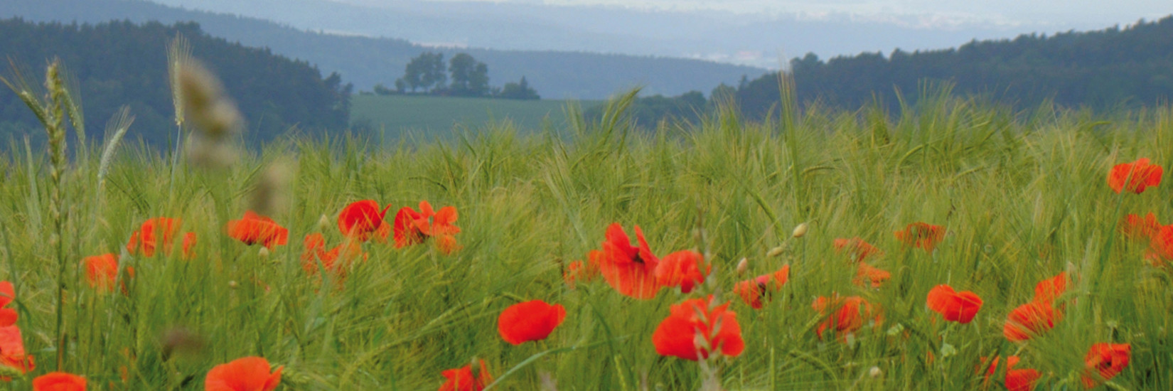 Je nach Stand des Getreides bieten sich weitw Blicke zurück Richtung Bayreuth. Nach einem leichten Rechtsbogen wandern wir mäßig ansteigend in den Wald hinein. Es folgen kurz hintereinander drei leichte Linksbögen, bis wir wieder auf offenes Feld mit einer geraden Passage zwischen Waldstreifen und Acker treffen. Bei der Abzweigung nach rechts, am Ende des Ackers halten wir uns geradeaus. Rechts zwischen den Feldern, bieten sich nach einem kleinen Anstieg Schritt für Schritt zunächst auf der rechten Seite Weitblicke Richtung Süden und Westen, bei guter Sicht sogar bis über Bayreuth hinaus.