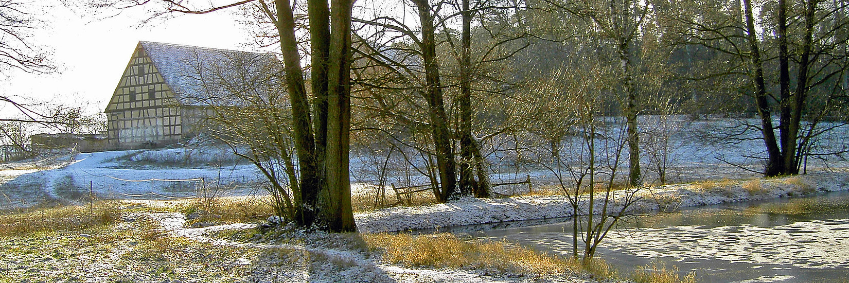 Bei der ersten Wegegabel entscheiden wir uns für den rechten Waldweg und sehen den Königshof nun von der Rückseite. Am Waldrand entlang führt uns ein Pfad zum Entengraben, einem kleinen Bachlauf. Wir folgen diesem bis auf der rechten Seite die letzte kleine Wiese endet. Hier links auf einen Waldpfad in den Mischwald einschwenken.