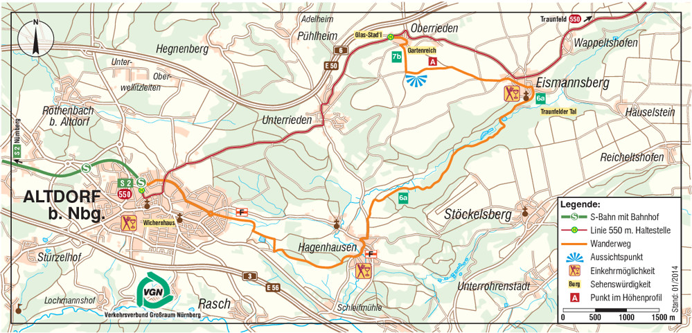 Nach den Abstechern zu zwei „Schmuckkästlein“, gleich zu Beginn der Wanderung vor den Toren der Wallensteinstadt Altdorf, führt die Tour über eine freie Hochfläche auf der Jurahöhe, dann hinab in einen Teil des Traunfelder Tales. Das Tal markiert hier fast identisch die oben am bewaldeten Steilhang verlaufende Grenze zwischen Mittelfranken und der Oberpfalz. Zwei für die Region typische Landgasthöfe laden in familiärer Atmosphäre zur Einkehr ein, bevor man im historischen Altdorf mit seinen geschichtsträchtigen Gebäuden und zahlreichen Einkehrmöglichkeiten den Tag ausklingen lassen kann.