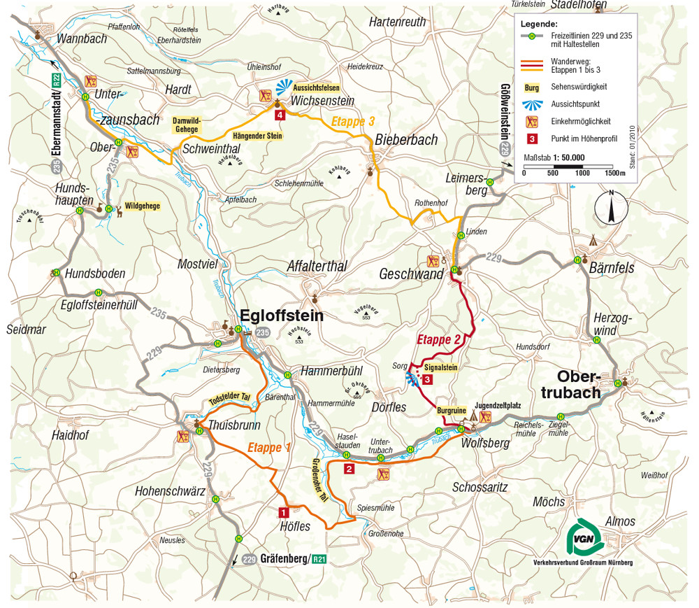 Von hier aus können Sie mit dem Wildpark-Express 235 nach Ebermannstadt RB 22oder nach Egloffstein fahren, wo Sie weitere Anschlussmöglichkeiten haben 229.