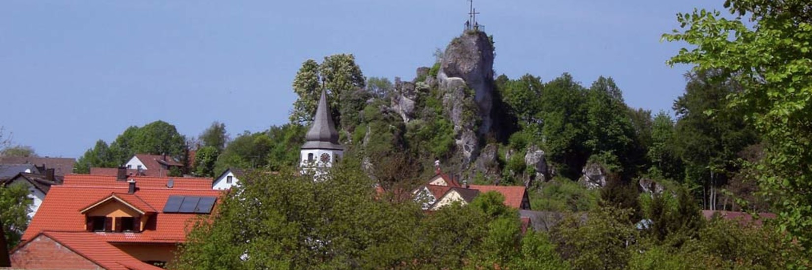 Bei der Einmündung in die Fahrstraße dann nach links in den Ort hinein. Ein kleiner Abstecher hoch zum Aussichtsplateau des Wichsensteins (588 m) lohnt sich allemal. Bei gutem Wetter hat man freien Blick bis ins Fichtelgebirge und zu den Gipfeln der Hersbrucker Schweiz.