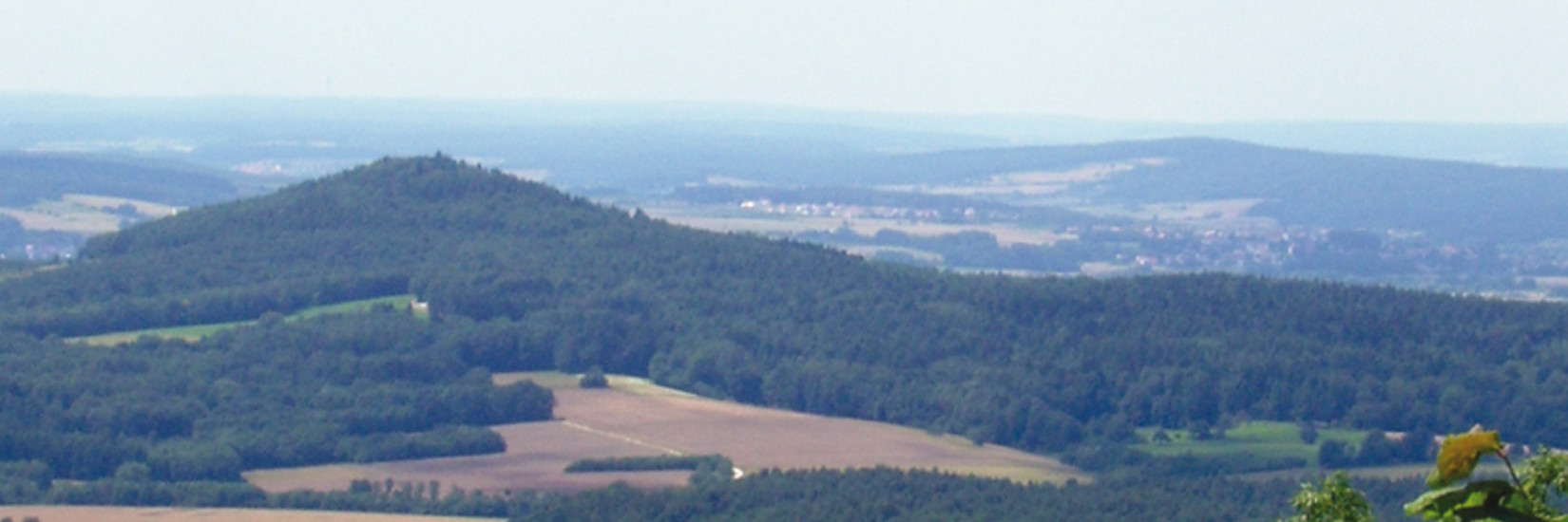 nach rechts in ein Waldstück (Landwirtschaftlicher Verkehr frei) den gelben Wegweisern nach, u. a. zur Fränkischen Fliegerschule. Der steinige Weg steigt langsam an und mündet neben der Einflugschneise des Flugplatzes in einen breiten Feldweg, auf dem wir linker Hand weiterwandern. Wir bleiben in zwei Bögen ca. 150 m unterhalb der Ausläufer des Flugfeldes (kleine Garage) am Waldrand, bewegen uns kurz vom Flugfeld weg und stoßen nach einer Hochspannungsleitung auf einen Querweg. Hier nun nach rechts entlang der 1999 gegründeten Sternwarte Feuerstein, die ihren Namen von der Burg übernommen hat.