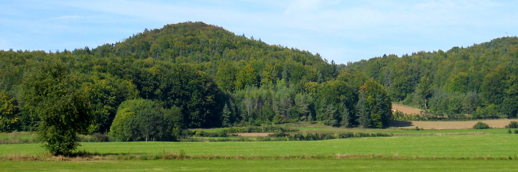 Auf dem Sträßchen gemütlich den Hügel hinauf, zweigt unser Weg dann vor dem Waldrand rechts ab. Nur noch wenige Meter auf Asphalt nach oben und gleich im Rechtsknick hinein in den Wald. Schritt für Schritt geht es auf einem schönen Waldweg aufwärts, dann ein Stück quer zum Hang und bald wieder leicht abwärts. Je nach Jahreszeit können wir uns an den heimischen Pflanzen und Sträuchern erfreuen.