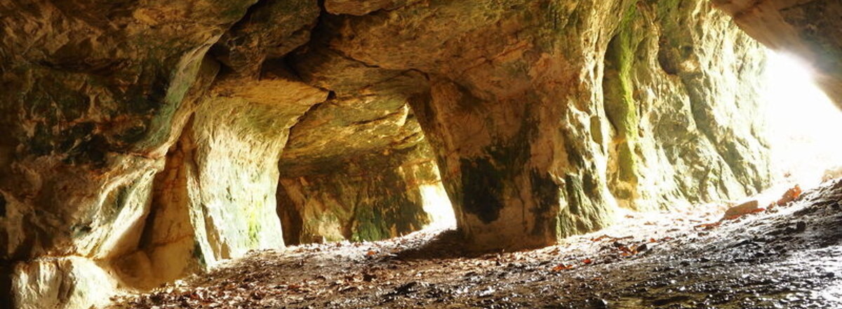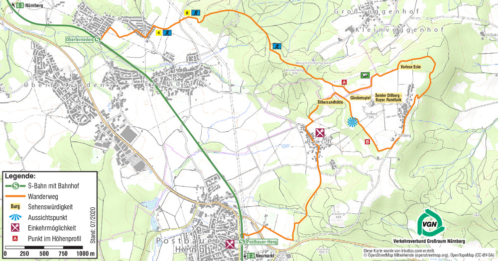 nach links in einen ansteigenden Wurzelweg und halten uns dabei nach einem kurzen Stück rechts. Nun geht’s den schmalen Hohlweg „fast senkrecht“ hoch – ein paar Sandsteinstufen schauen durch den Untergrund, dann wird der breite Wurzelweg wieder flacher – und über den bewaldeten Brentenberg, der kaum 20 m niedriger als der Dillberg ist. Weiter der Markierung des schwarz/blauen Nordic Walkers folgen, in leichtem Linksbogen stoßen wir auf einen breiten Schotterweg. Die Markierung