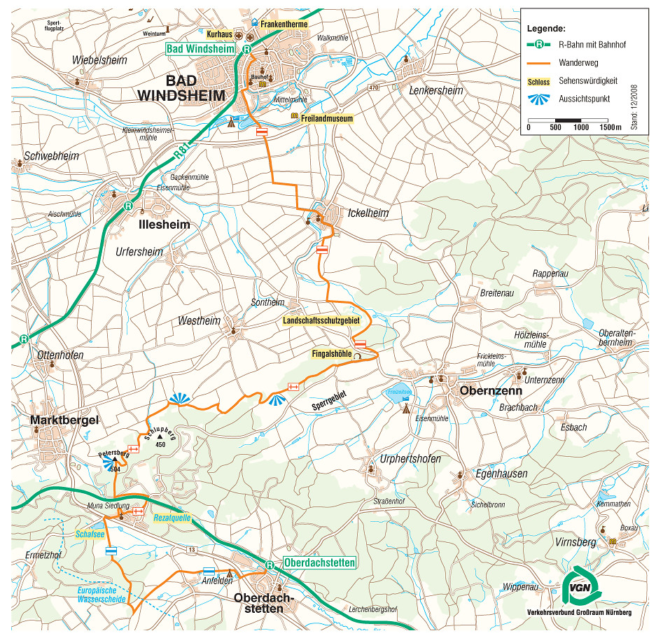 Auf ihr beschreiten wir eine 180°-Kehre, lassen den Schafstall rechts liegen, und treffen oben am Scheitelpunkt vor einer Hochebene auf eine Querstraße (Sperrgebiet). Auf der fein geschotterten Straße wenden wir uns nach links, vorbei an einem riesigen Kirschgarten linker Hand, bis wir die Hochfäche, nach einer Schranke, in den Wald hinein verlassen. Die schattenspendende Waldstraße bringt uns zu einer Lichtung – mit schöner Aussicht ins Aischtal. Nach rechts öffnet sich der Wald und die fein geschotterte Piste ist bis zur Einmündung in eine Betonstraße („Panzerstraße“), die leicht ansteigt, unser Weg. Nach 200 m geht es linker Hand an einer Wasserversorgungsanlage vorbei, rechter Hand vor uns liegt Obernzenn.