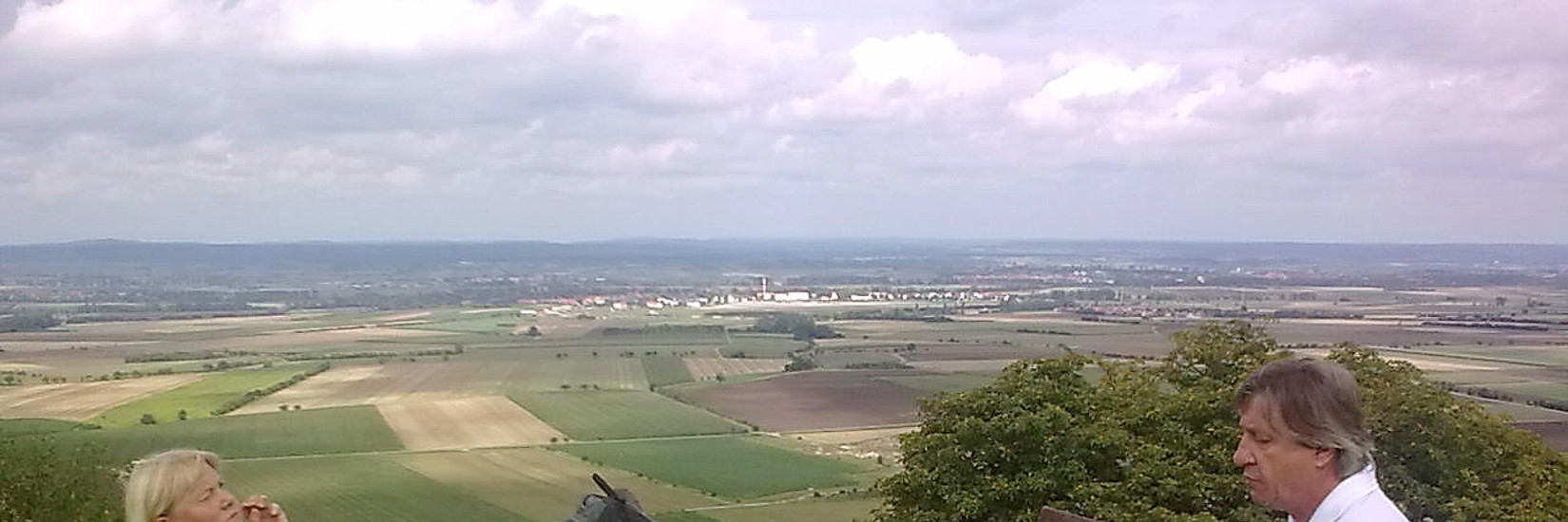 Aufgepasst! Nach knapp 100 m führt uns ein Pfad, halbrechts nahezu unvermittelt über einen Graben. Unterhalb der dicht bewachsenen Heckenreihe, ohne sichtbaren Weg, wandern wir über die Brachwiese bis zu einer rund 150 m entfernten Querhecke. Wir suchen uns eine wenige Meter nach links versetzte Lücke und arbeiten uns vorsichtig durch das Heckenwerk – hier hat die Natur ihren Platz wieder zurückerobert. Mit herrlich weitschweifenden Blicken geht es danach über die Wiesenfluren weiter. Vor uns liegt Westheim, links dahinter Illesheim, am Horizont die Burg Hoheneck.