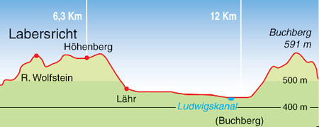 nach rechts ab und wandern über die Wiesen, die im Frühjahr eine reiche Blumenpracht zeigen. Leicht ansteigend erreichen wir Labersricht, einen verträumten Weiler am Fuße des Wolfstein.