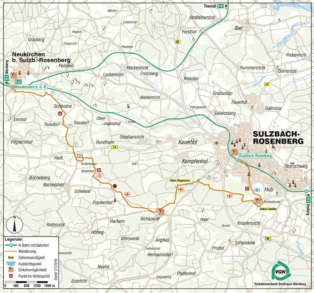Wan­der­kar­te – Neukirchen (b. S-R) - Fichtelbrunn - Aichazant - Breitenbrunn - Sulzbach-Rosenberg (05.02.2016)