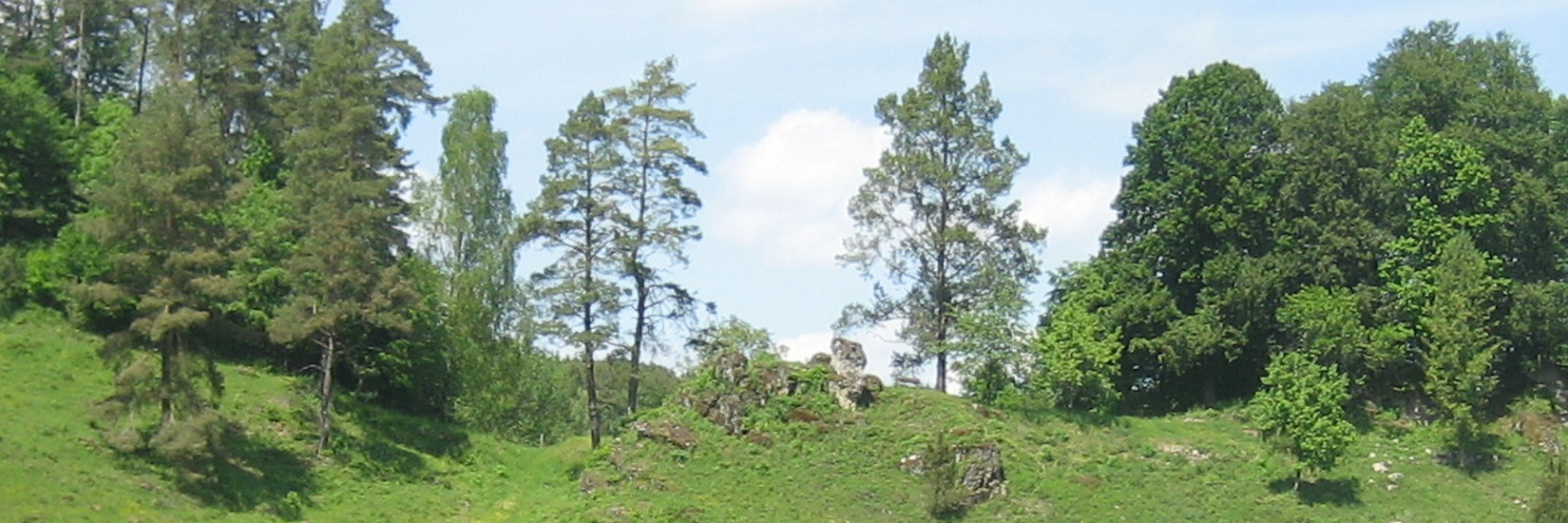 als kurzer Begleiter. Hinter der Einzäunung am linken Wegesrand erneut links am Gelände des DSC Etzelwang entlang und vor zu den schon von der anderen Talseite gesehenen Felsformationen. Von der Rastbank aus bietet sich ein schöner Blick hinunter ins Tal des Etzelbaches.