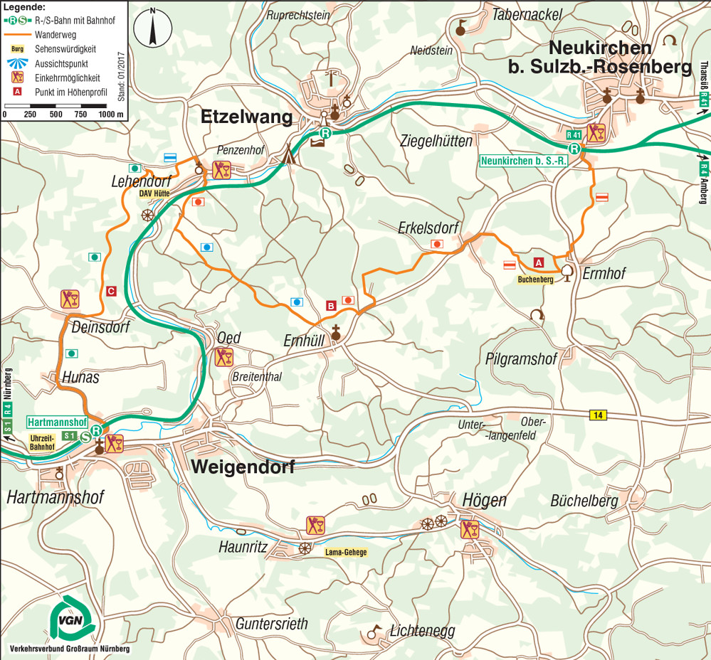, vor allem wegen der guten Anbindung von Nürnberg, Amberg oder Hersbruck her, Ausgangspunkt einer VGN-Wanderung. Am Bahnhofsvorplatz in Neukirchen (bei Sulzbach-Rosenberg) orientieren wir uns – wie schon bei vielen Wanderungen von hier aus – an der örtlichen Wandertafel. Der